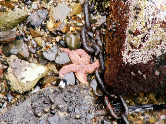 Starfish, piece of chain, rocks at low tide in Acadia National Park.