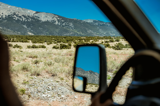 A reflection of the Rio Grande Mountains while just outside Great Sand Dunes National Park, We rented a 2005 Tioga RV to travel Colorado last summer.
