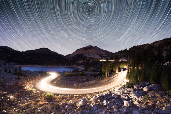 The October Country - An overnight long-exposure of Lassen Peak, the whirling heavens, and the rush of visitors along the park road.
