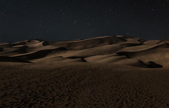 Stars behind sand dunes illuminated by the setting Moon in Colorado's Great Sand Dunes National Park.