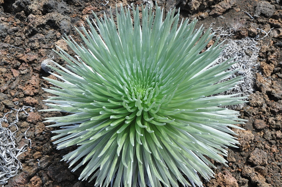 After watching sunrise, we hiked down into the Haleakala caldera along the Keonehe'ehe'e (Sliding Sands) trail and out the Halemau'u trail. Silversword were abundant; we saw them in bloom and in early stages of growth.