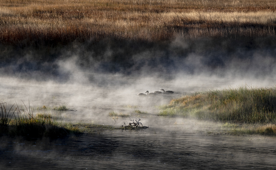 Sunrise with ducks on the Madison River in Yellowstone Park.