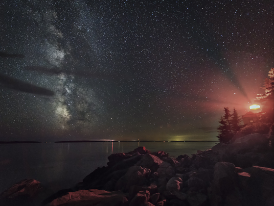 Milkyway at Bass Harbor Lighthouse. with Mars (and its reflection) on the horizon