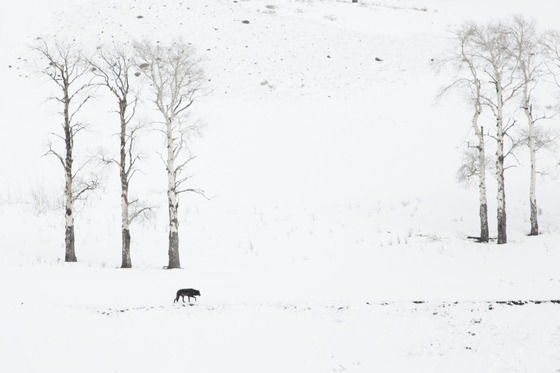 While in Yellowstone in last Spring I noticed this lone wolf walking slowly along the valley in the distance. He looked tired and weary and I loved the lonely look he portrayed to me as he walked.