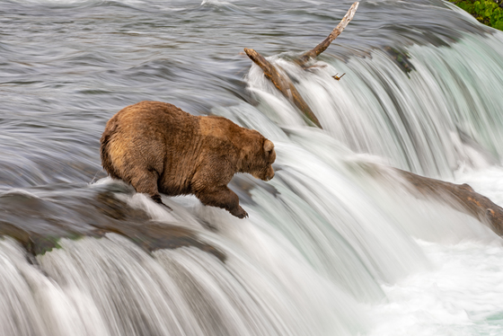 Patiently Waiting - She would approach the edge, secure a spot, right paw raised up and then she would freeze. Focused below on the fish, trying to anticipate the next one to jump. Occasionally she would reach out with that paw attempting to pull in a leaping fish. She sat so still I was able to slow the shutter speed down, smoothing out the water.