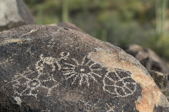 A photo of some of the Hohokam petroglyphs in the park in the Signal Hill area, Saguaro National park West