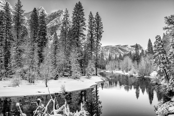 Morning on the Merced. The beauty of a winter wonderland. Early morning at Cathedral Beach, Yosemite NP.