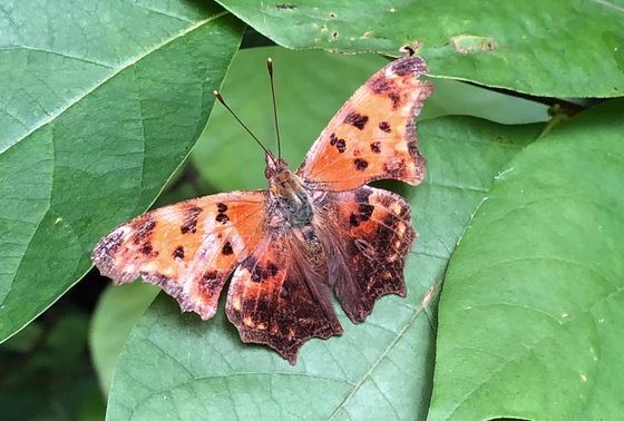 A photo of a somewhat bedraggled but still beautiful comma butterfly.