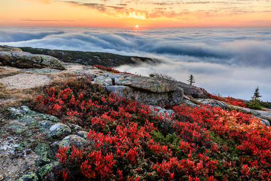 Tagged: acadia national park cadillac mountain summit top peak shuxu berry granite maine sunrise cloud sea rock stone moss lichen red fog island fall autumn slab