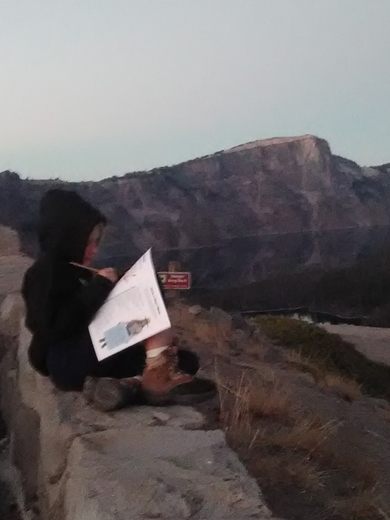 Daughter (9) spent all day filling out her Jr ranger packet, here she is on her last project as the sun had set and the moon was on the horizon, she wants to be a park ranger when she grows up! This picture was taken at Crater Lake National Park overlooking wizard island, her favorite feature of the park.