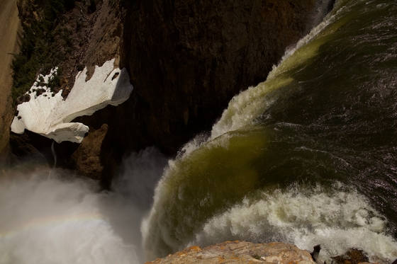 The lower falls at canyon. The water tumbles to the river below, but not without creating a rainbow!