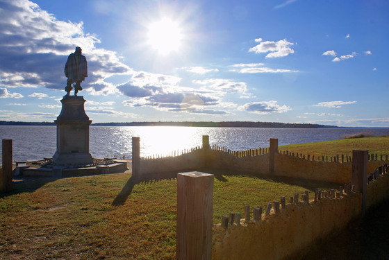 Jamestowne ruins and statue of Captain John Smith overlooking the James River as sunset approaches. The site marks the location of Jamestowne fort, the first permanent British settlement in North America. Historic Jamestown