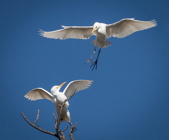 Great White Egrets vie for the same branch as they migrate from here to there (where ever the here and there are), and take a rest mid journey.