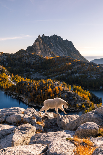 A lone goat enjoys Sunrise over the Alpine Lakes Wilderness in Washington.