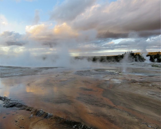 The Black Sand Basin in Yellowstone National Park is a geothermal wonderland, featuring lots of springs and small geysers. On this particular evening, the sky and the ground seemed to merge together as the sunset turned the cumulus clouds above a shade of orange that nearly matched the orange hue of the ground. It was a beautiful evening--one I won't soon forget!