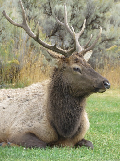 Elk are a fairly common sight in Yellowstone National Park. This particular bull elk was very cooperative, posing for photos near the terraces on the north side of the park. Using a telephoto zoom, I was able to capture photos of this elk from a safe distance (beside a friendly ranger). In this particular photo, the elk almost appears to be smiling for the camera.