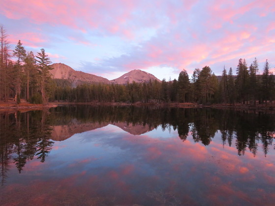 Lassen Volcanic National Park resides in Northern California at the southern end of the Cascade Range. It features numerous types of volcanoes (and related features), the most prominent being Lassen Peak. In this photo, Lassen Peak is illuminated by a stunningly bright sunset. The entire scene is reflected in aptly-named Reflection Lake.