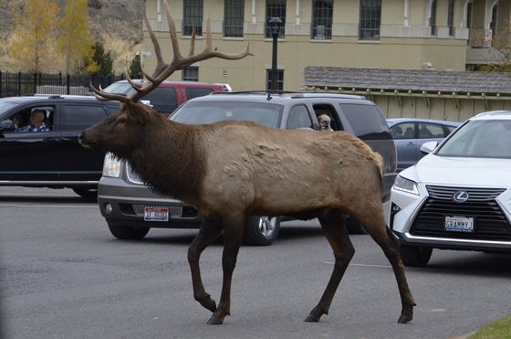 Mammoth Hot Springs in Yellowstone National Park is usually filled with people and elk. This bull elk was busy trying to keep all his "girls" in line.