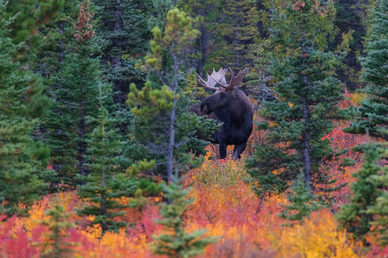 A gorgeous autumn setting at dusk for one of Glacier National Park's bull moose.
