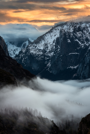 Winter fog, snow, and a sunrise burn with a partially obscured Half Dome