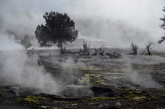 A fall hoarfrost brought an almost apocalyptic scene to an already bizarre landscape at Biscuit Basin in Yellowstone National Park.
