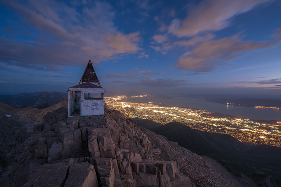 The old hut on the summit of Mount Timpanogos as night falls over the Utah Valley