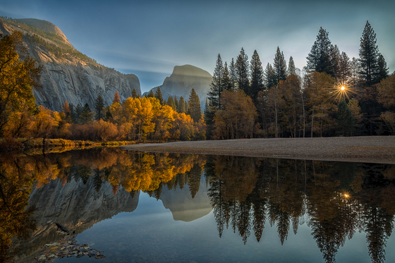 Errant beam of sunlight illuminating the vibrant colors of the autumn trees as the morning breaks over Yosemite valley. The radiance of the sun and the reflection in the water adds more beauty to the place.