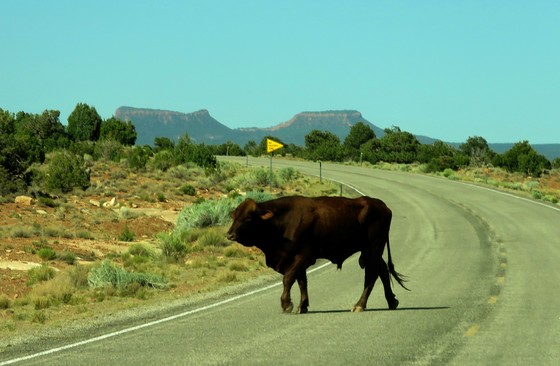 A lone bull crosses the road that meanders thru this shrinking national monument...ignoring the signage.