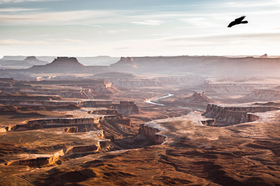 A raven takes flight over the canyons and the Green River in Canyonlands National Park