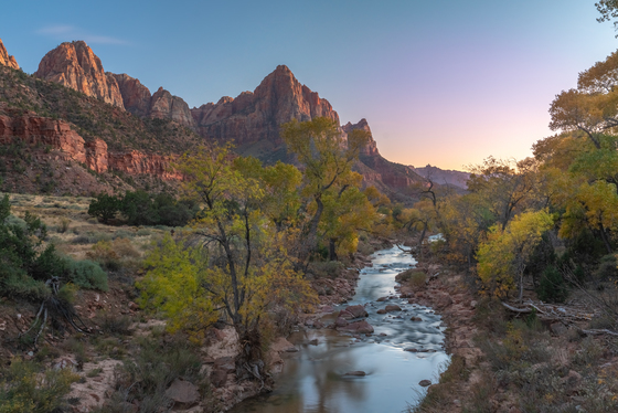 Sunset at the Virgin River. I found a bridge slightly closer to the Watchman and less busy than the Canyon Junction Bridge. The fall colors were still on fall display in early November.