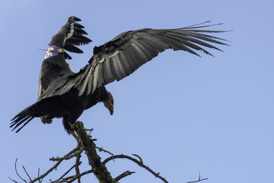 Condor #46 lands on an old snag above the Pacific Ocean coast