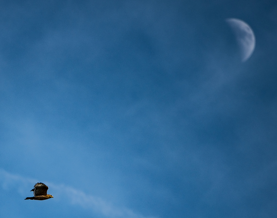 Hawk flying by the moon.