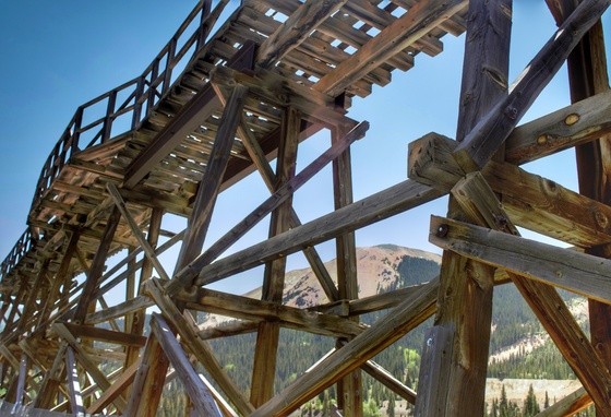 Driving in the Uncompahgre National Forest, south of Ouray, Colorado, along the scenic Million Dollar Highway, you will find the Idarado Mine Trestle near the ghost town of Ironton. In this photo, the historic remains of the Idarado Mining Company (gold mine) frame the colorful peak of Red Mountain in the background.