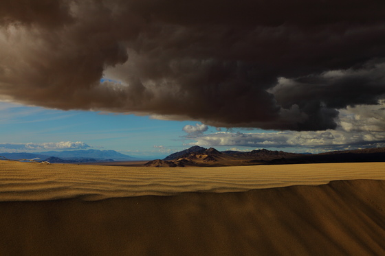 The sand was wet, so we were able to cover a lot more ground while hiking the Kelso Dunes after the rain. Some of the storm clouds were sticking around, but the sun was also shining, creating some dramatic shadows. I really liked this perspective with a relatively flat area at the top of a dune and the black Storm clouds not too far above.