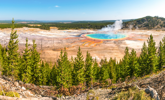 Vivid Landscape of Color — A striking view of Yellowstone's colorful and unique landscape overlooking Grand Prismatic Spring.
