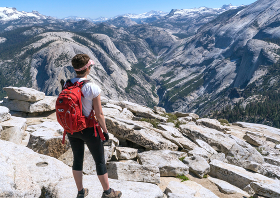 Atop a Granite Cathedral — Hiker breathing in the light and inspiration of the Sierra Nevada Mountains from the summit of Yosemite's iconic Half Dome.