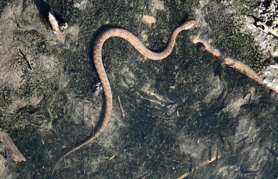 A northern brown water snake feeding on small fish in a wetland by the bike trail in October.