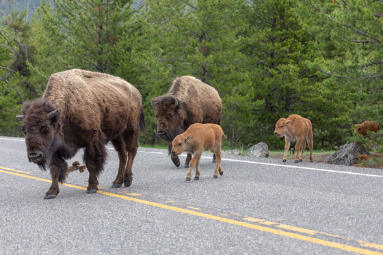 Bison and young calves crossing the road. Notice the bird flying between the legs of the lead bison. Early June, 2018.
