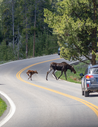Young moose tries to keep up with Mom, crossing the road.