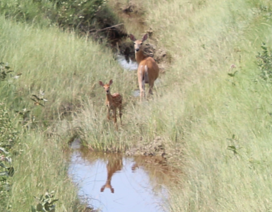 Doe and fawn in stream