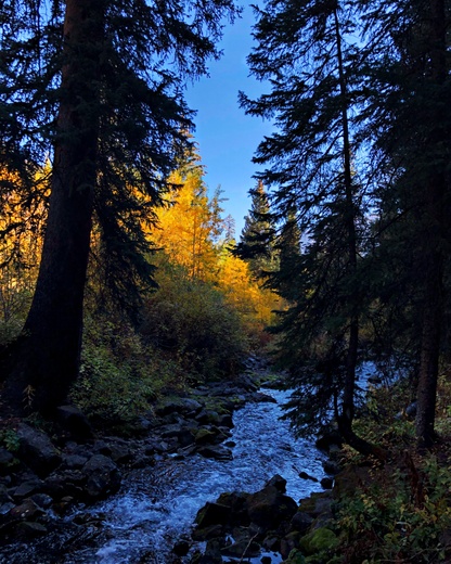 Splash of Color: A River Runs Through The Yellow Aspens & Giant Conifers