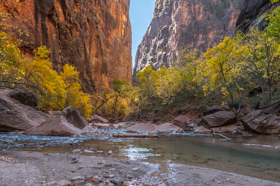 Leaving the Narrows toward Riverwalk in Zion National Park. I had to stop and take a moment to admire the fall foliage.