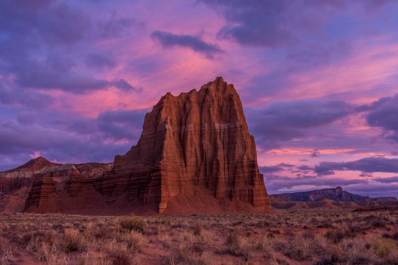Deep inside Capitol Reef NP, you can find prehistoric monolithic reefs, such as this, towering over the surrounding landscape. On this particular morning, the sky was glowing vibrantly, and it felt as though you had been transported back to another age of the Earth.