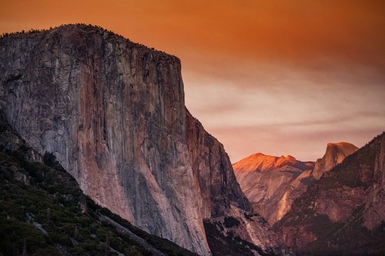 El Capitan and the other breathtaking formations that make up the Yosemite Valley, as seen from Tunnel View, illuminated under a brilliant orange sky - a phenomenon created in part from wildfires burning in the area.