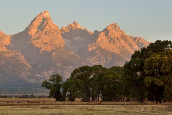 Sunrise alpenglow illuminates the towering granite spires of the Teton Range.