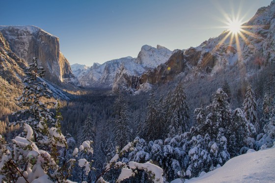 A rare spring snow blanketed Yosemite Valley rendering a winter wonderland scene, the sun rising burst its rays casting a glorious effect on the snow. How beautiful is Yosemite!