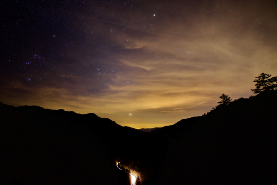 Under the Stars It was a magical night under the stars, Pleiades, and Venus. Every time I get to see the beautiful starlit sky, I feel humbled to remember we live on a very tiny spot on this vast ever expanding universe. Living in city life has its disadvantages wrt night sky viewing and feels lucky when we can drive to Smokies on weekends. Golden glow above in the sky is of sunset at the west as the picture was taken just after the dark. The light trail is from the busy road below.