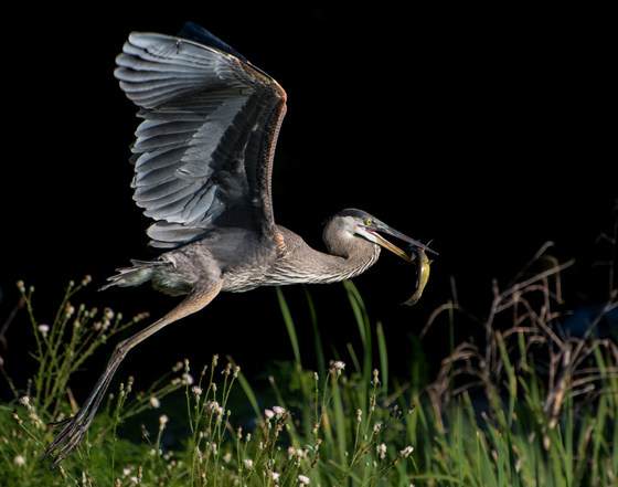 Great Blue Heron flying away with a Catfish dinner.