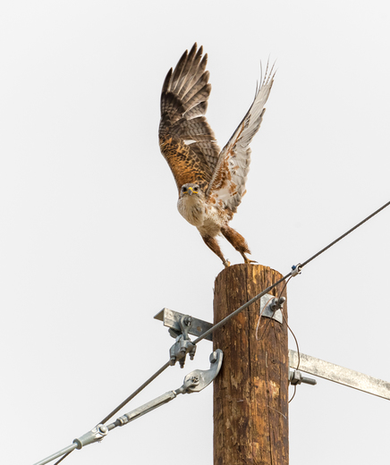 A Ferruginous Hawk takes flight from the top of a telephone pole.