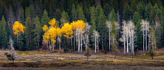 A stand of Aspens in Fall color stand in stark contrast to the evergreen forest behind them